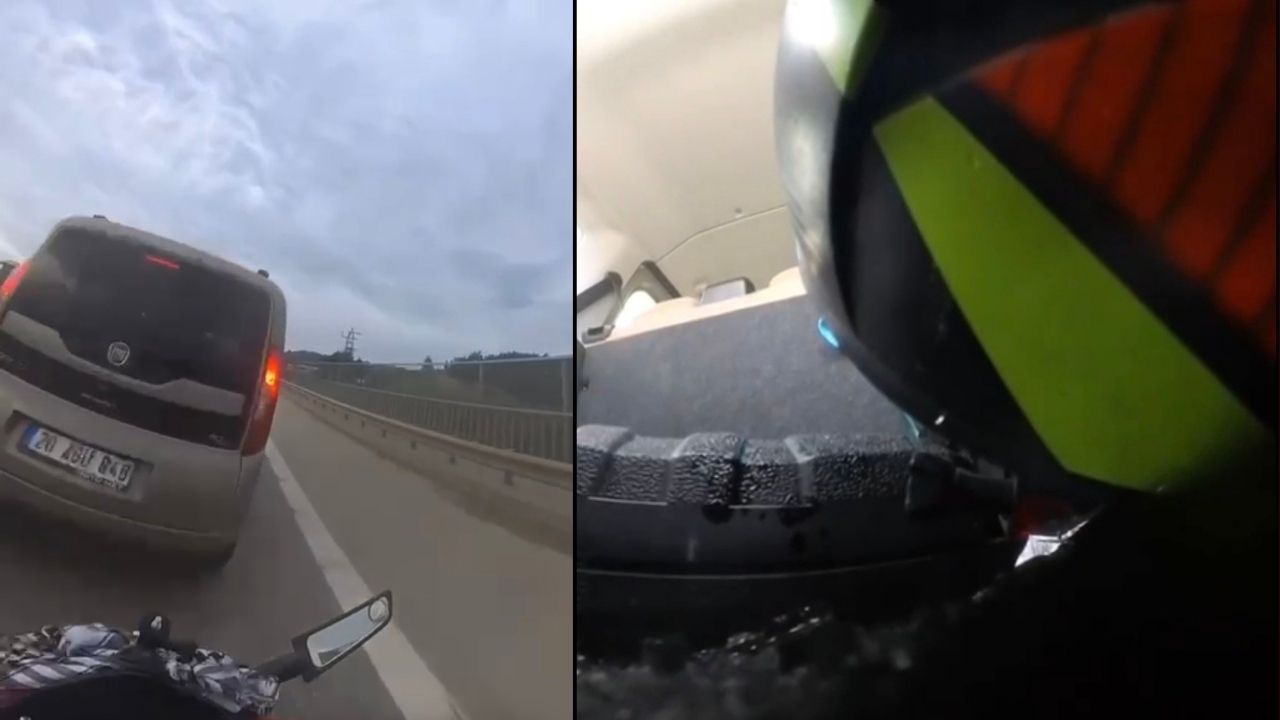 Kaza, merkez Osmangazi ilçesi Bursa-Yalova Otoyolu'nda meydana geldi. Saatte 113 kilometre hızla giden motosiklet, önünde duran hafif ticari araca çarptı. Kazada motosiklet sürücüsü, başını çarparak kırdığı aracın arka camından içeriye girdi. Belden yukarısı araç içinde kalan sürücünün kolları kırılırken, kaza kask kamerasına yansıdı.