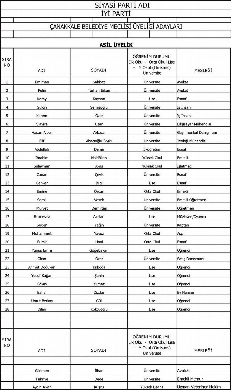 31 Mart tarihinde yapılacak yerel seçimler için, İYİ Parti’nin Çanakkale belediye meclisi üyesi aday listelerinde şu isimler yer aldı;