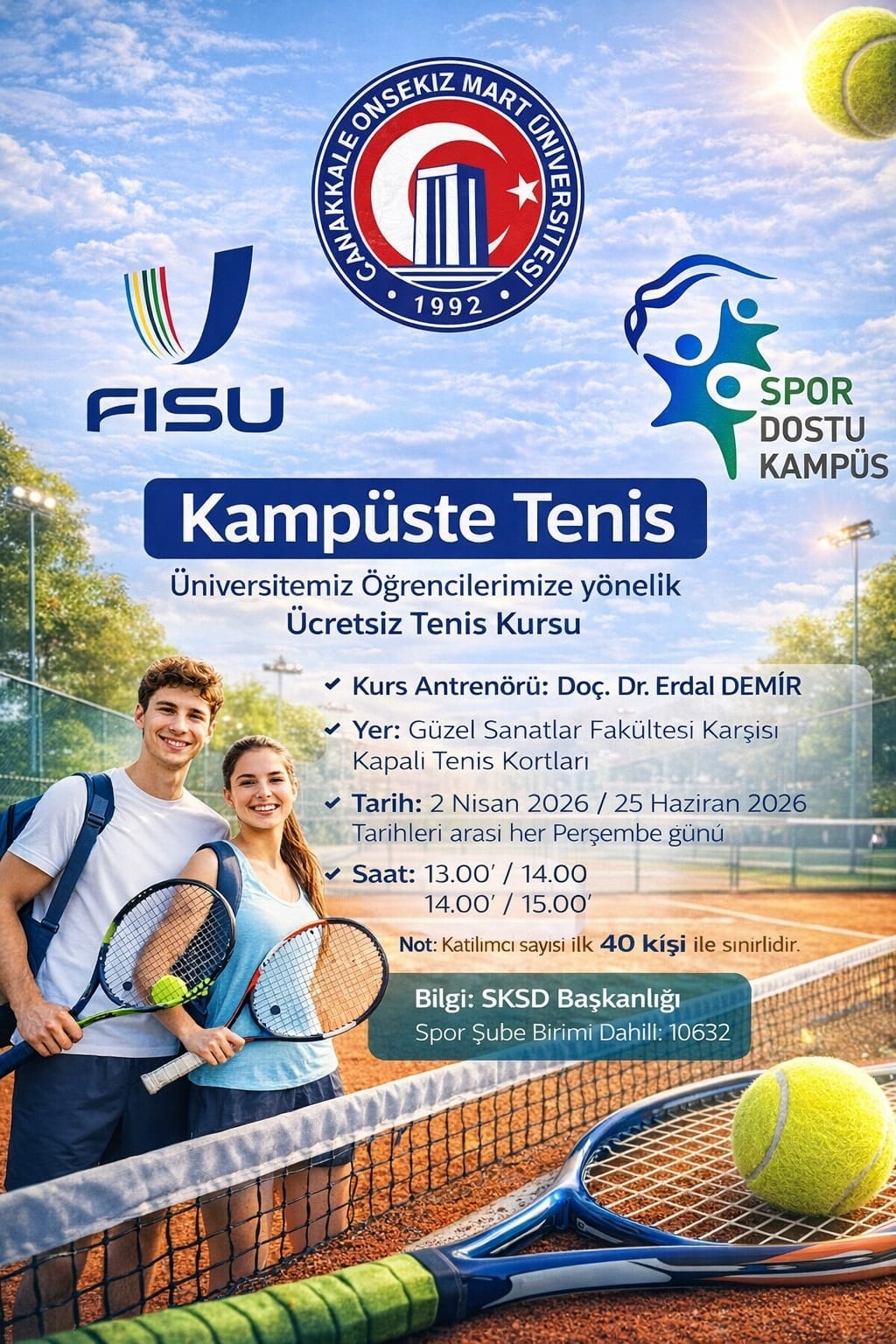 Ücretsiz tenis kursunun antrenörlüğünü Doç. Dr. Erdal Demir üstlenecek. Dersler, Güzel Sanatlar Fakültesi karşısında bulunan Kapalı Tenis Kortları’nda gerçekleştirilecek.
