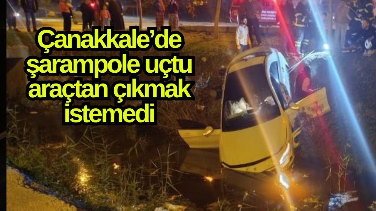 Çanakkale'de kontrolden çıkan otomobilin şarampole uçtuğu kazada karı koca yaralandı. Yaralı sürücü, araçtan inmeyerek ekiplere zor anlar yaşattı.
