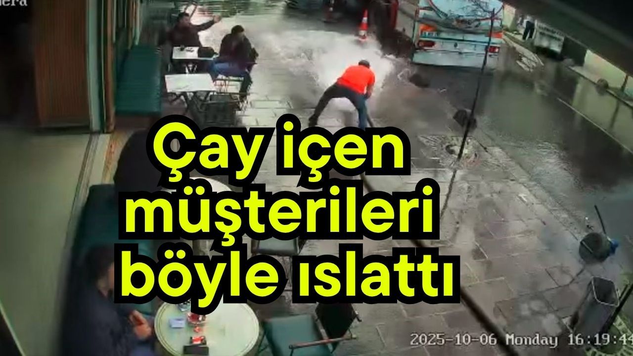 Olay, dün saat 16.00 sıralarında Bayrampaşa’da meydana geldi. Edinilen bilgiye göre bir kafe işletmecisi, iş yerinin önünü tazyikli su ile yıkamak istedi. Tazyikli suyun azizliğine uğrayan işletmeci bir süre sonra hortumun kontrolünü kaybetti. Şov yapayım derken tazyikli suyun azizliğine uğrayan esnaf, o esnada kafe önünde çay içen müşterilerini ıslattı. Ne olduğunu anlamaya çalışan müşteriler kaçışırken, yaşanan o anlar güvenlik kamerasına yansıdı.