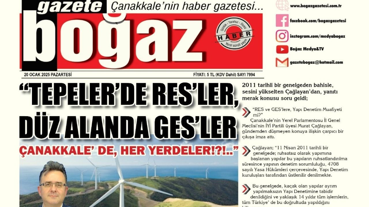 Çanakkale Boğaz Gazetesi 20 Ocak Pazartesi sayısı