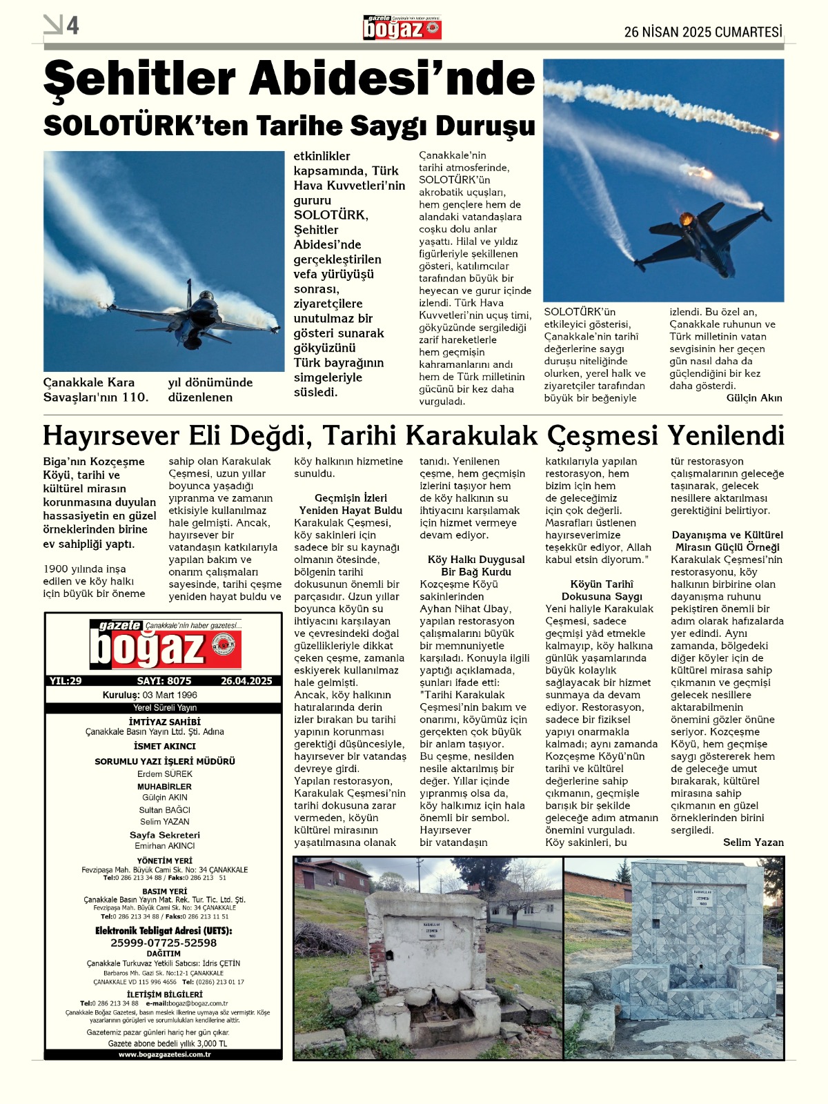 Çanakkale Boğaz Gazetesi 26 Nisan Cumartesi