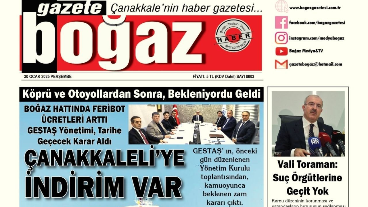Çanakkale Boğaz Gazetesi 30 Ocak Perşembe sayısı