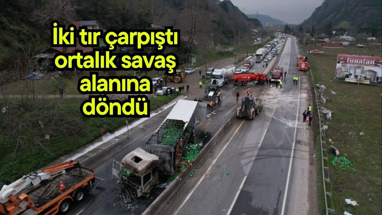 D-650 kara yolu Sakarya geçişinde çarpışan iki tırdan biri alev aldı. Karşı yönden gelen otomobilin parçalanan beton bariyere çarpması sonucu karı-koca yaralanırken, yolda uzun araç kuyrukları oluştu.