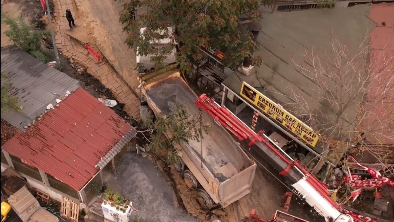 Olay, sabah saatlerinde Eyüpsultan Topçular Mahallesi Şeyh Raşit Caddesinde meydana geldi. Edinilen bilgiye göre hafriyat kamyonu elektrik hattı çalışması için açılan kazı alanına saplandı. Hafriyat kamyonunun çamura saplandığı esnada yan tarafta bulunan çay ocağının duvarına zarar verdi. İhbar üzerine olay yerine ekip sevk edildi. Hafriyat kamyonu daha sonra vinç yardımıyla saplandığı yerden çıkarıldı. Çalışmaların yapıldığı anlar ise havadan görüntülendi.