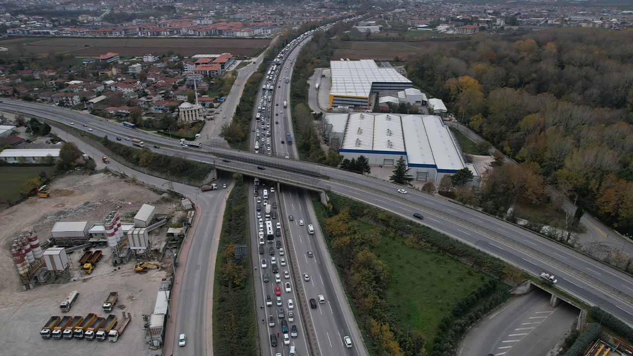 Kazaya ilişkin inceleme başlatılırken, kaza bölgesi ve yolda oluşan araç kuyruğu havadan görüntülendi.