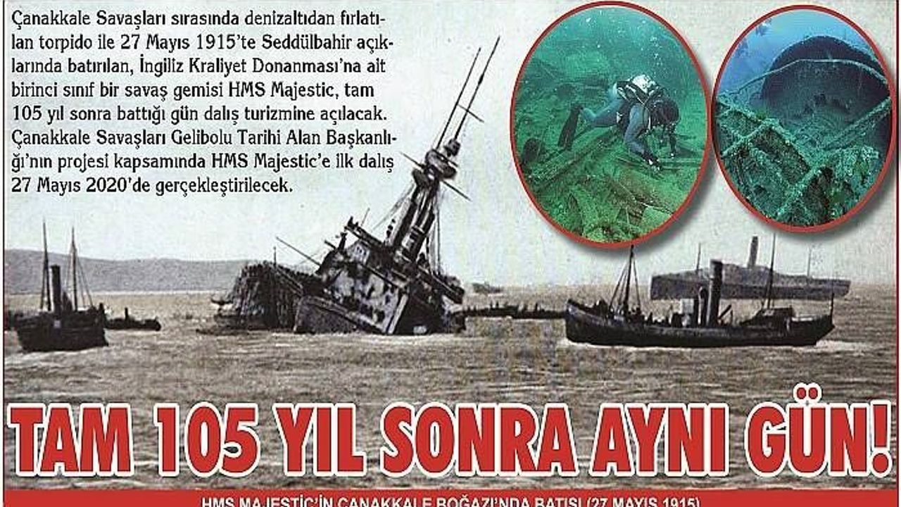 Çanakkale Savaşları sırasında denizaltıdan fırlatılan torpido ile 27 Mayıs 1915’te Seddülbahir açıklarında batırılan, İngiliz Kraliyet Donanması’na ait birinci sınıf bir savaş gemisi HMS Majestic, tam 105 yıl sonra battığı gün dalış turizmine açılacak. Çanakkale Savaşları Gelibolu Tarihi Alan Başkanlığı’nın projesi kapsamında HMS Majestic’e ilk dalış 27 Mayıs 2020’de gerçekleştirilecek.