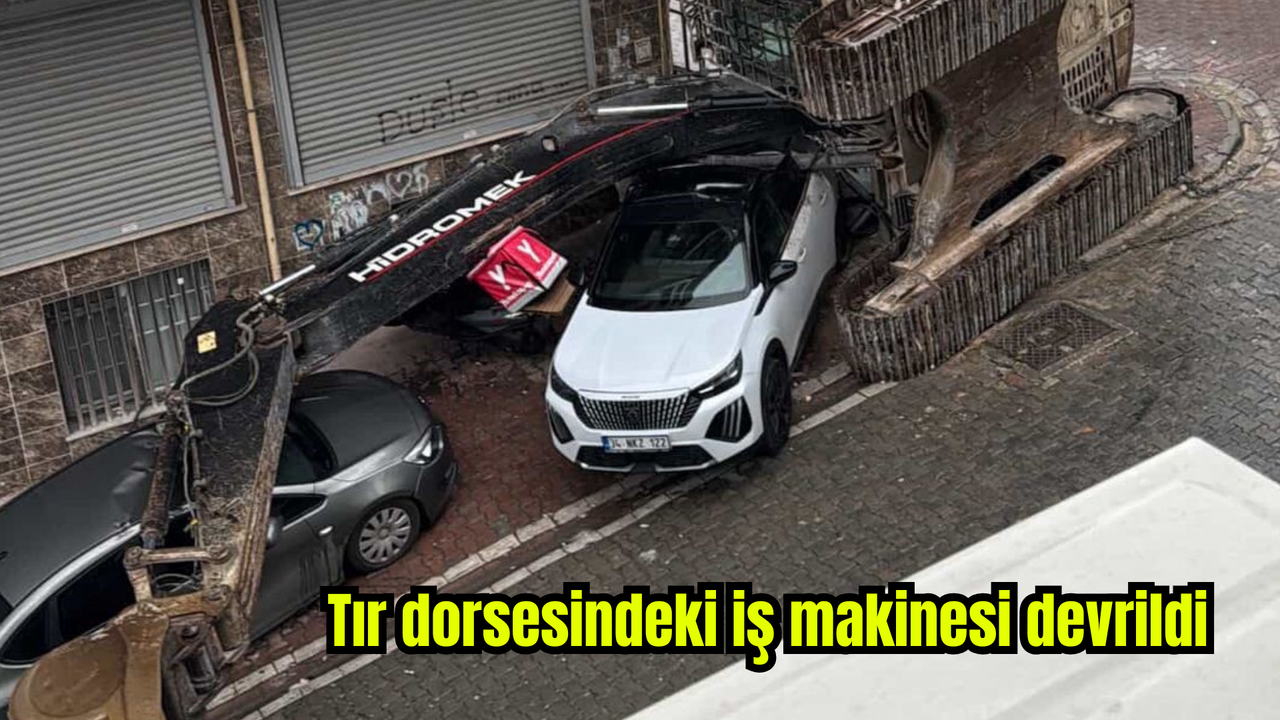 Olay, Esenyurt Pınar Mahallesi 1245 Sokak’ta meydana geldi. İddiaya göre seyir halindeki tır dorsesinde taşınan iş makinesi bilinmeyen bir nedenle devrildi. Park halindeki iki otomobil ve bir motosikletin hasar gördüğü olayda şans eseri ölen ya da yaralanan olmadı. Devrilen iş makinesi vinç yardımı ile kaldırılırken kaza anı, çevredeki güvenlik kamerasına yansıdı. Görüntülerde iş makinesinin devrildiği ve kepçesinin araçların üzerine düştüğü görüldü.