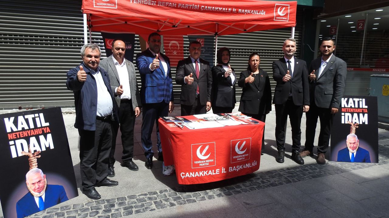 Yeniden Refah Partisi Genel Başkanı Doktor Fatih Erbakan Tarafından yurt genelinde eşzamanlı olarak başlatılan "Kürecik Kapatılsın, İsrail'de Hayat Dursun", “Ceyhan Boru Hattı Kapatılsın”, "Netanyahu Yargılansın" ve “Netenyahu İdam Edilsin” imza kampanyası çerçevesinde Çanakkale merkez ve ilçelerinde de imza kampanyası başlatıldı. Yeniden Refah Partisi Çanakkale İl Başkanı Mehmet Yüzbaşı Çanakkale ve ilçelerinde başlatılan imza kampanyasının startını Çanakkale merkezde çarşı caddesine kurulan imza çadırında verdi. Yüzbaşı, imza çadırında yaptığı açıklamada “Yeniden Refah Partisi Genel Başkanımız Doktor Fatih Erbakan başkanlığında bugün Türkiye genelinde eş zamanlı olarak imza kampanyası başlatıyoruz. "Kürecik Kapatılsın, İsrail'de Hayat Dursun", “Ceyhan Boru Hattı Kapatılsın”, "Netanyahu Yargılansın" ve “Netenyahu İdam Edilsin” başlıkları ile başlattığımız imza kampanyasına tüm Çanakkalelilerden imza atarak destek vermelerini bekliyoruz.” dedi.